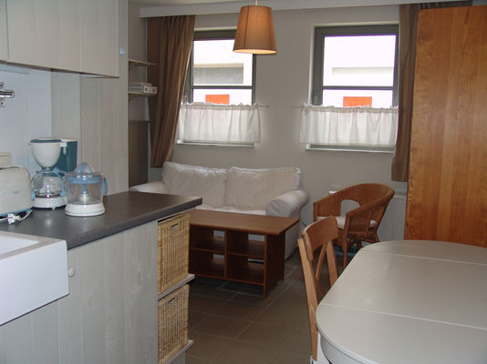 Eigen keuken met kookplaat, koelkast, koffiezet, fruitpers en broodrooster